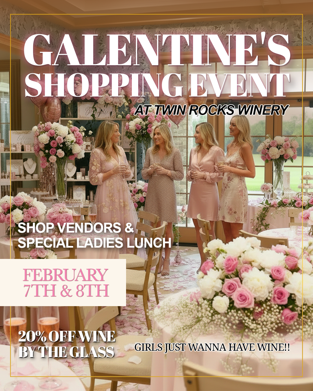 During your visit, enjoy 20% off wine by the glass all day long while you browse our exclusive vendor market featuring unique finds from local boutiques. This event is free, but if you would like to reserve a table for wine tasting or our special Galentine’s Lunch, please click the button below.